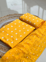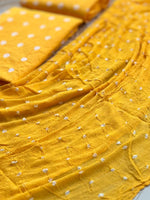 The Pure Cotton Bandhani Dupatta Suit is a stunning ensemble that merges two iconic Indian textile traditions. The suit's dupatta, adorned with Bandhani patterns, adds an extra layer of texture and visual interest to the ensemble. Along with Top & cotton dupatta. Available in Attractive colors and designs.