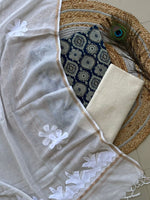 This elegant set features an Ajrakh-printed top crafted from high-quality 60 x 60 count cotton, ensuring comfort and breathability. It is paired with a beautifully designed Kota Doriya dupatta, adorned with intricate hand applique work, adding a touch of sophistication. The ensemble is completed with a matching bottom and a delicate zari border, making it a perfect choice for a graceful and stylish look.