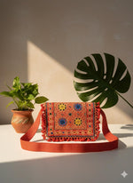 Bring a pop of tradition to your everyday look with this vibrant Ajrakh Patchwork Sling Bag. Featuring handmade tassels, a zip & button closure, and inside pockets, it blends style with utility.